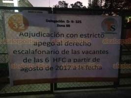 Presentes desde las 6:00 horas, los docentes colgaron en las rejas de la SEV mantas con los mensajes "Los derechos de los trabajadores no tienen siglas sindicales, los procesos administrativos de la SEV deben ser iguales para todos" y "Adjudicación con estricto apego al derecho escalafonario de las vacantes de las 6 HFC a partir de agosto de 2017 a la fecha".