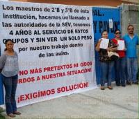 Los profesores inconformes, colocaron una manta en la entrada de la escuela con el siguiente texto, “Los maestros de 2 “B” y 3 “B” de esta institución, hacemos un llamado a las autoridades de la SEV, tenemos cuatro años al servicio de estos grupos sin ver un solo peso por nuestro trabajo dentro de la aula”.