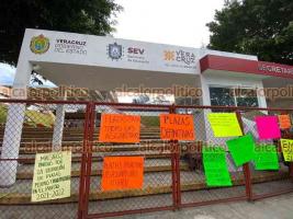 Con pancartas y bambalinas colocadas en el portón principal, los manifestantes exigen “No a la venta de plazas”, “Plazas definitivas, no temporales, TEBAEV”, “Plazas para todas las asignaturas” y señalan a Recursos Humanos de sólo dar largas, “queremos respuestas, ¿por qué no se avanza en el proceso?”, al tiempo de pedir la intervención del gobernador Cuitláhuac García y del titular de la SEV, Zenyazen Roberto Escobar García, porque cada vez “están pidiendo más requisitos”.