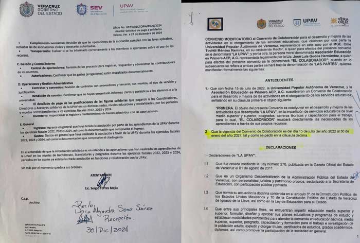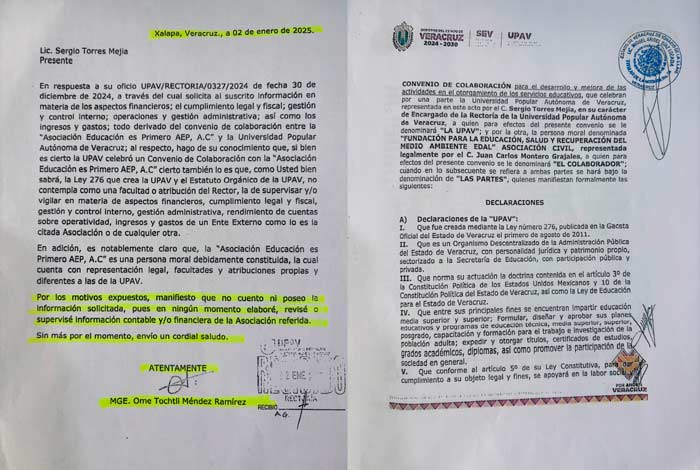 El ya para entonces exrector de la UPAV respondía así al oficio UPAV/RECTORIA/0327/20224 de fecha 30 de diciembre de 2024, del rector Sergio Torres Mejía, quien le pidió “información en materia de los aspectos financieros; el cumplimiento legal y fiscal; gestión y control interno; operaciones y gestión administrativa; así como los ingresos y gastos; todo derivado del convenio de colaboración entre la ‘Asociación Educación es Primero AEP, A.C.’ y la UPAV”.