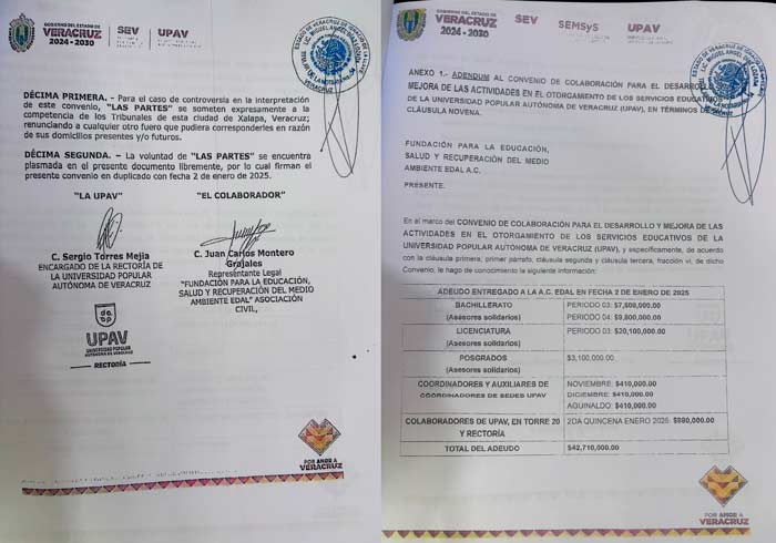 El trabajo que ofreció la “Fundación para la Educación, Salud y Recuperación del Medio Ambiente, EDAL Asociación Civil”, fue muy amplio. No sólo brindar la supervisión, apoyo técnico y económico para el adecuado cumplimiento de las obligaciones objeto del convenio, también apoyar en la selección y colaboración de los interesados en la colaboración de los servicios educativos que brinda la UPAV. En uno de los anexos a este convenio quedó de manifiesto que los adeudos entregados por la anterior asociación civil fueron de 42 millones 710 mil pesos, desglosados de la siguiente manera: