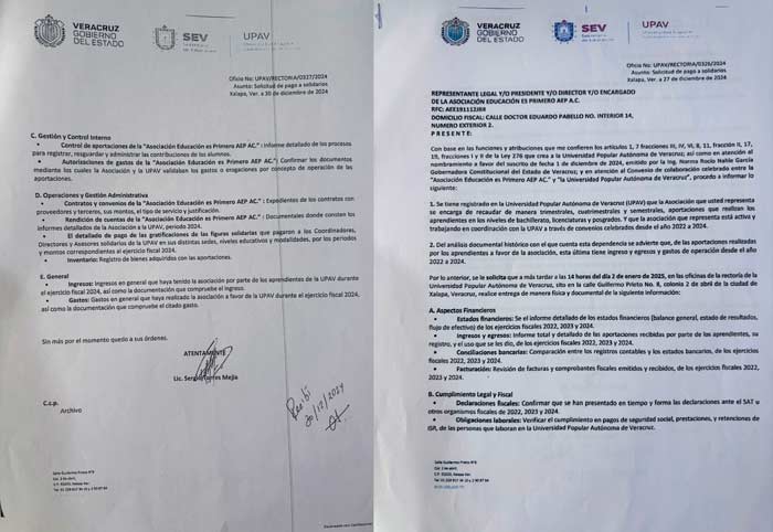 Según el Oficio 0327/2024 de la Rectoría de la UPAV, dirigido al exrector Ome Tochtli Méndez Ramírez, se le exigió que el día 2 de enero de 2025 entregara los estados financieros de la “Asociación Educación es Primero AEP, A.C.”. También los ingresos y egresos de las mismas; las conciliaciones bancarias, la facturación respectiva, las declaraciones fiscales y las obligaciones laborales, esto debido a que ninguna información al respecto estaba en la carpeta de entrega-recepción,
