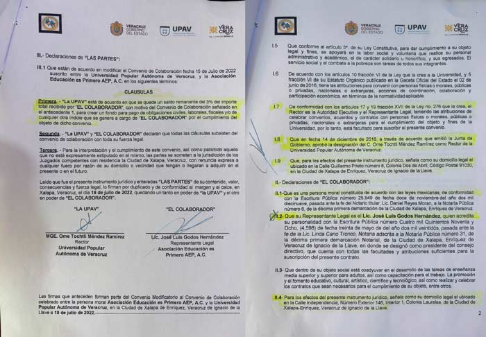 En el documento queda de manifiesto que el rector de la UPAV es Ome Tochtli Méndez Ramírez, designado por la Junta de Gobierno el 14 de diciembre de 2018 y que “EL COLABORADOR” es la “Asociación Educación es Primero AEP, A.C.”, una “persona moral constituida de acuerdo con las leyes mexicanas, de conformidad con la escritura pública número 25,949 de fecha 12 de noviembre del año 2019”. El representante legal es José Luis Godos Hernández.