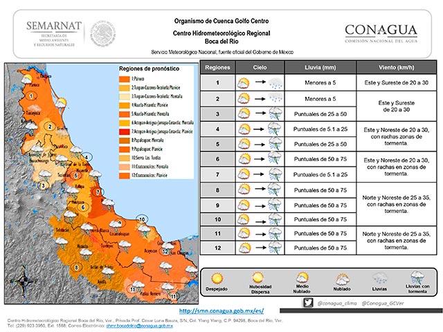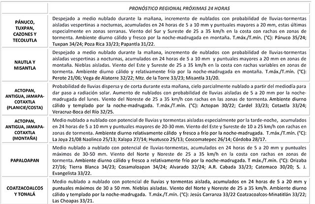 Se esperan condiciones para esta mañana de domingo de cielo medio nublado a nublado, en la zona centro y sur del Estado; así como parcialmente nublado hacia el norte. Continuará el ambiente cálido y bochornoso en zonas de planicie-costa. Por la tarde se prevén lluvias ligeras a moderadas típicas de la temporada, que se podrían acompañar de tormentas eléctricas y viento arrachado. Los acumulados de lluvia más importantes se estarían registrando en sur y zonas serranas, con menor intensidad en el resto del Estado.