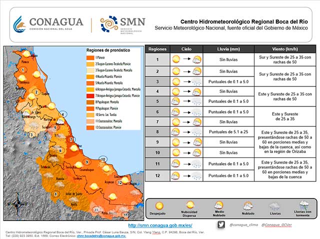El viento será del Sur y Sureste en Tamaulipas y norte de Veracruz, del Este y Sureste en el resto de Veracruz; manteniéndose velocidades de 25 a 35 km/h en ambos casos y presentándose rachas de 50 a 60 km/h en Tamaulipas, costa del norte de Veracruz y como porciones medias y bajas de las cuencas del Papaloapan y Coatzacoalcos.