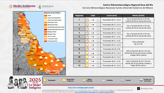 En Veracruz se prevén lluvias con intervalos de chubascos (5.1 a 25 mm) en zonas montañosas, especialmente del Nautla, Actopan, La Antigua, Jamapa-Cotaxtla y Papaloapan, siendo posible eventos superiores en partes altas del Papaloapan; lluvias escasas o lloviznas (0.1 a 5.0 mm) en el resto de las porciones norte y sur, así como aisladas en la costa central.