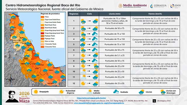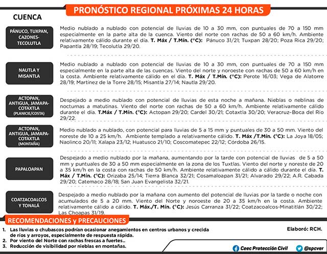 Esta mañana se presenta nubosidad con potencial de lluvias fuertes a muy fuertes especialmente en la zona norte y centro del estado de Veracruz. El viento será del Norte con rachas frescas a fuertes por lo que el ambiente podría refrescar. Consulte el aviso especial.