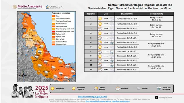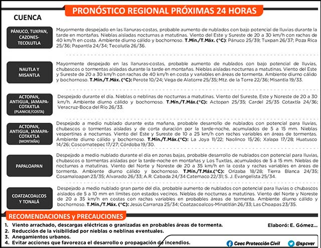 En Veracruz se prevén tormentas puntuales fuertes (25 a 50 mm) en zonas montañosas del Papaloapan; lluvias con intervalos de chubascos (5.1 a 25 mm) en las cuencas del Coatzacoalcos y Tonalá, resto del Papaloapan y región de Los Tuxtlas, así como zonas montañosas del Tecolutla, Nautla, Actopan, La Antigua y Jamapa-Cotaxtla; lluvias escasas o lloviznas (0.1 a 5.0 mm) en el resto de las zonas montañosas y aisladas en el resto de la región.