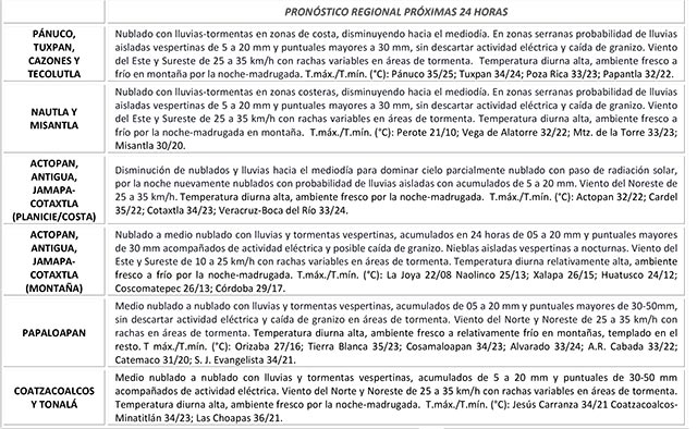Se prevé que las áreas de tormentas y lluvias presentes esta mañana en las zonas de costa disminuyan en las próximas horas, para dar paso a cielo parcialmente nublado con paso de radiación solar en gran parte del Estado hacia el mediodía. Dicha situación generaría la persistencia de ambiente relativamente cálido a cálido y con sensación de bochorno en zonas de planicie-costa. En regiones de montaña y porción sur por la tarde-noche nuevamente se esperan tormentas y lluvias con actividad eléctrica y viento arrachado; sin descartar caída de granizo en zonas serranas.