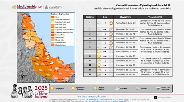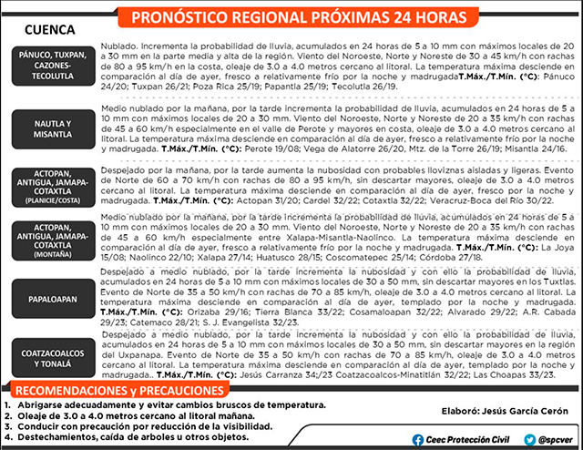 Evento de Norte con rachas fuertes a violentas en costas, oleaje elevado y potencial para lloviznas, lluvias y tormentas moderadas a fuertes, especialmente entre cuencas del Cazones- Actopan, Los Tuxtlas y la región del Uxpanapa. La temperatura máxima desciende.