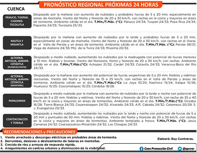 En Veracruz se prevén tormentas puntuales muy fuertes (50 a 75 mm) en las cuencas del Coatzacoalcos y Tonalá, así como porciones medias y altas del Papaloapan; tormentas puntuales fuertes (25 a 50 mm) en las cuencas del Pánuco y Tuxpan, así como en zonas montañosas del Cazones, Tecolutla y Nautla, así como resto del Papaloapan; lluvias con intervalos de chubascos (5.1 a 25 mm) en el resto de las zonas montañosas; lluvias escasas o lloviznas (0.1 a 5.0 mm) en zonas de planicie y costa del norte y centro de la región. El viento será del este y sureste en Tamaulipas; en Veracruz será del noroeste durante la noche y del noreste durante el día; presentándose en todos los casos de 25 a 35 km/h. Se mantendrá un ambiente diurno cálido a caluroso, especialmente en Tamaulipas y costa de Veracruz; durante la noche se mantendrá templado a cálido en ambas entidades, así como fresco a frío en zonas serranas. Temperaturas mínimas para el domingo: Tuxpan 24°C, Martínez de la Torre 23°C, Xalapa 17°C, Veracruz 24°C, Orizaba 17°C, Catemaco 20°C, Coatzacoalcos 23°C.