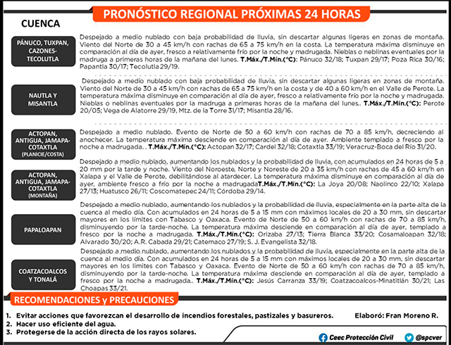 Evento de Norte se mantendrá este día, con rachas de 70 a 85 km/h en las costas centro y sur, y de 65 a 75 km/h en la costa norte y de 45 a 60 km/h en la parte alta entre Xalapa-Naolinco-Misantla y valle de Perote, decreciendo por la tarde y noche. Aumento del potencial para lluvias.