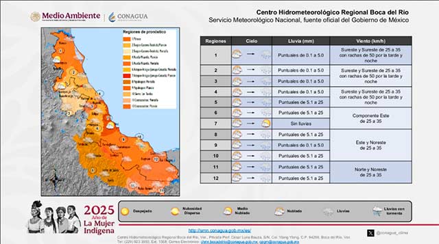 El viento será del Sur y Sureste en Tamaulipas y norte de Veracruz, mientras que en el resto será del Este y Noreste; presentándose en todos los casos con velocidades de 25 a 35 km/h, así como la presencia de rachas de 50 km/h durante la tarde y noche en el norte y centro de Tamaulipas y costa norte de Veracruz.