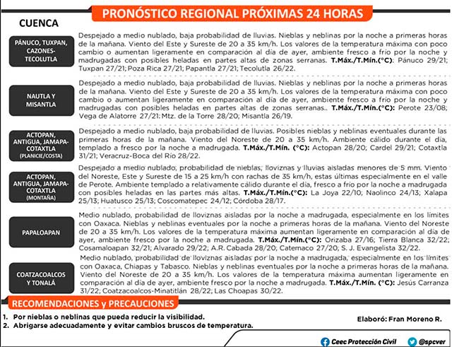 Previendo en Tamaulipas lluvias escasas o lloviznas (0.1 a 5.0 mm) en la región de la Sierra Madre y las cuencas del Guayalejo-Tamesí y Tamuín, presentándose aisladas en la cuenca del Soto La Marina. En Veracruz se prevén lluvias con intervalos de chubascos (5.1 a 25 mm) en las cuencas del Coatzacoalcos y Tonalá, así como la región de Los Tuxtlas y zonas montañosas del Nautla, Actopan, La Antigua, Jamapa-Cotaxtla y Papaloapan; lluvias escasas o lloviznas (0.1 a 5.0 mm) en el resto de las zonas montañosas y el resto de la porción sur, así como aisladas en el resto de la porción norte.