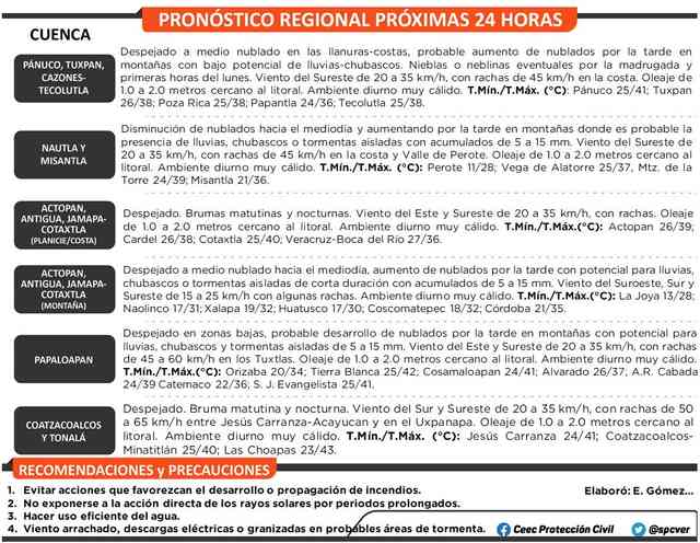 Varios sistemas de baja presión sobre la región centro-sur de E.U.A., (frentes y líneas secas) y vaguadas de norte a centro del país mantendrán el viento del sur y sureste en gran parte del litoral del Golfo de México y rachas frescas en la costa norte, Perote y Orizaba, ocasionalmente fuertes en Los Tuxtlas y Acayucan, el ambiente diurno muy cálido a bochornoso.