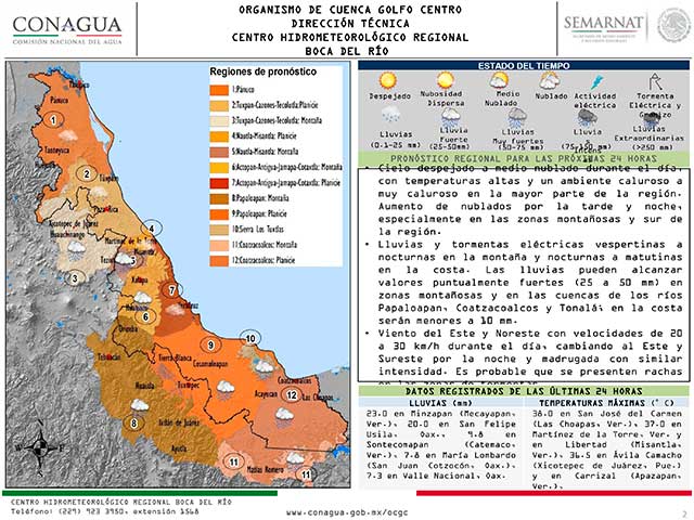 Para este día se esperan pocos cambios en la circulación atmosférica regional, por lo que el sistema de alta presión continuará cubriendo el Golfo de México, favoreciendo cielo despejado a medio nublado con un ambiente caluroso a muy caluroso en la mayor parte de la región. No obstante, debido al moderado ingreso de humedad, así como al calentamiento diurno y al forzamiento orográfico, por la tarde y noche aumentarán los nublados con probabilidad para chubascos aislados (lluvias fuertes, tormentas eléctricas y ráfagas de viento), especialmente en las zonas montañosas y porción sur de la región, mientras que en la zona de costa, se mantendrá la posibilidad de algunas lluvias nocturnas a matutinas menores a 10 mm.