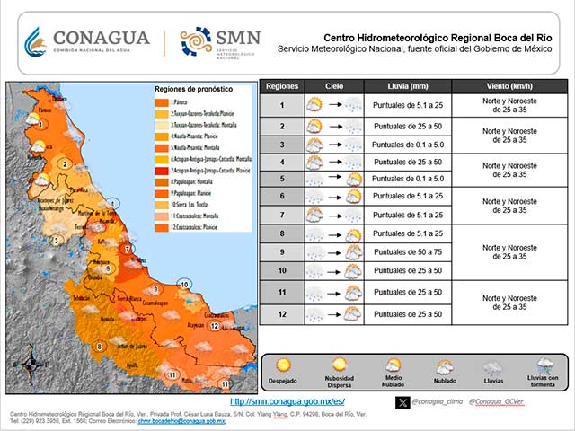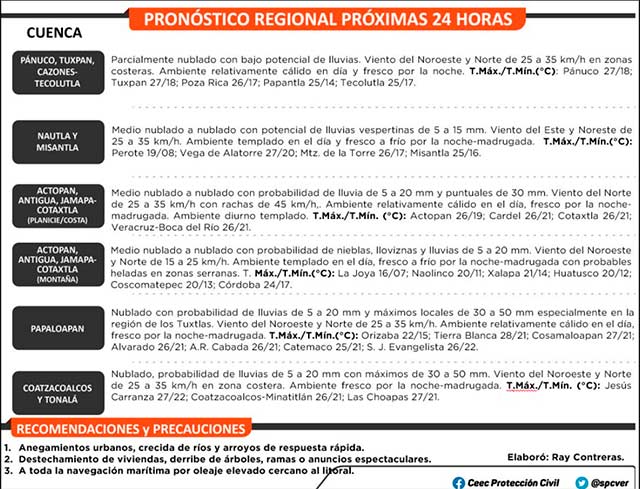En Veracruz se prevén tormentas puntuales fuertes (25 a 50 mm) en el Coatzacoalcos y Tonalá, así como la región de Los Tuxtlas y porciones medias y bajas del Papaloapan, presentándose aisladas en zonas de costa del Cazones, Tecolutla, Nautla y Misantla, siendo posible algún evento aislado superior en la parte media y baja del Papaloapan; lluvias con intervalos de chubascos (5.1 a 25 mm) en el Pánuco, Tuxpan, Actopan, La Antigua, Jamapa-Cotaxtla y resto del Papaloapan; lluvias escasas o lloviznas (0.1 a 5.0 mm) en el resto.