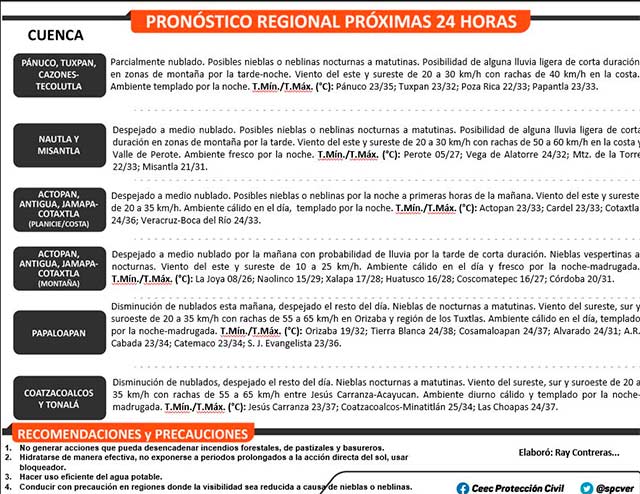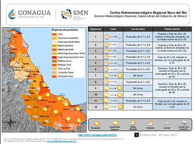 Temperaturas máximas para este día y mínimas para el lunes: Tuxpan 32/23°C, Martínez de la Torre 34/24°C, Xalapa 30/15°C, Veracruz 32/24°C, Orizaba 31/16°C, Catemaco 33/20°C, Coatzacoalcos 35/23°C.