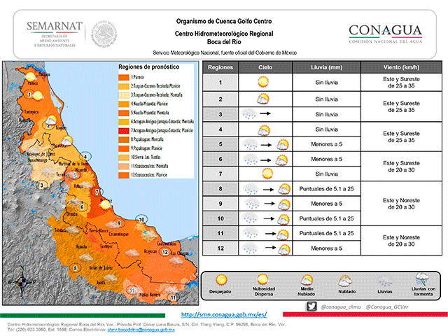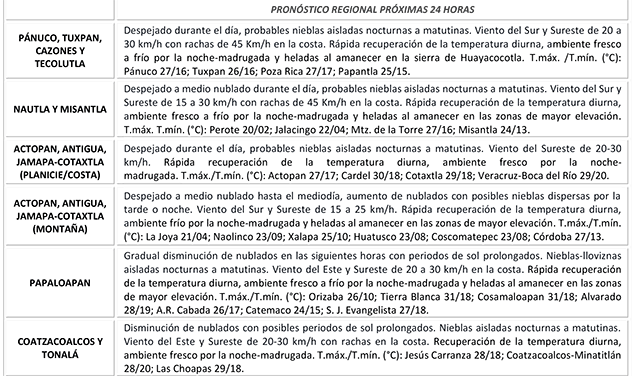 Hoy condiciones de tiempo estable con periodos de sol prolongados y rápida recuperación de la temperatura diurna y habrá cambios importantes a partir del mediodía de mañana con la llegada del Frente Frío número 24, aumento de nublados y del potencial de lluvias, evento de “Norte” y descenso de temperatura. Consulte el aviso especial al respecto y tome precauciones.