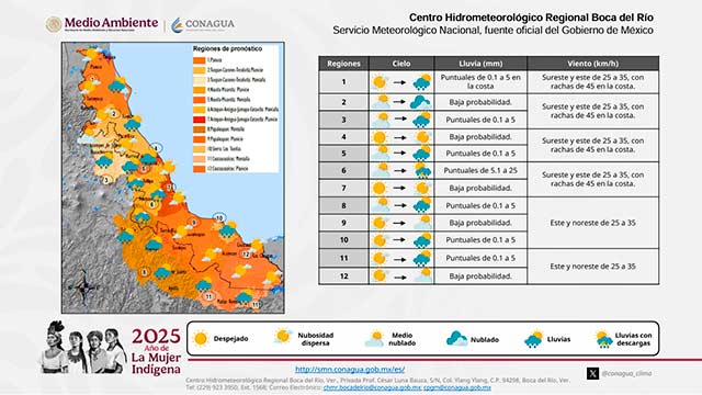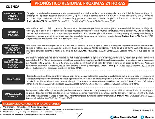 Se analiza al Frente Frío 10 en el noreste del territorio nacional, delante del frente una vaguada con eje a lo largo de Tamaulipas y una dorsal con eje del noreste al centro del Golfo de México; este último sistema, al interaccionar con el viento de la atmósfera alta, favorece que en nuestra entidad las condiciones de tiempo sean relativamente estables, con baja probabilidad de lluvias y tormentas, sin que se descarten eventos dispersos en zonas de montaña y las cuencas del sur. A la par, las temperaturas máximas serán relativamente calurosas, especialmente en llanuras y costas; en contraste, el ambiente para esta noche, madrugada-amanecer del lunes, será fresco a frío en regiones montañosas y templado a fresco en el resto del Estado. El viento dominante será del sureste, este y noreste con velocidades de 20 a 35 km/h con rachas de hasta 45 km/h y el oleaje cercano a la costa continuará de 0.2 a 1.0 metros.