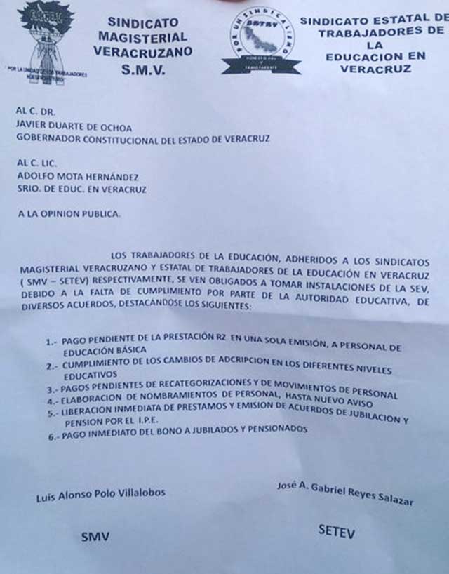 El pliego petitorio define que desde el año pasado (2013) acordó la Secretaría de Educación otorgar diversas prestaciones pero debido al incumplimiento de las mismas, es que deciden tomar las instalaciones de ambas depenedencias estatales.