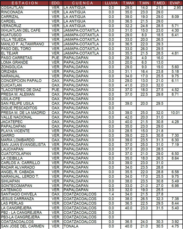 - Carrizal, 39°C; Xalapa, 32.8°C; Veracruz, 32.2°C; Coatzacoalcos, 36.5°C