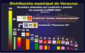 La alianza opositora “Veracruz Va” que abarcó en campaña a 93 ayuntamientos de los partidos PRI, PRD y PAN, sumarían sólo 21 triunfos, tomando en cuenta únicamente las demarcaciones en que compitieron juntos.