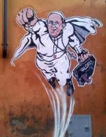 Vestido con su esclavina blanca, el Pontífice emprende el vuelo y enarbola un maletín negro cargado de "valores", según pinta el graffiti.