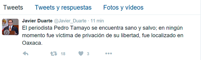 - El gobernador Javier Duarte tuiteó que fue localizado en Oaxaca