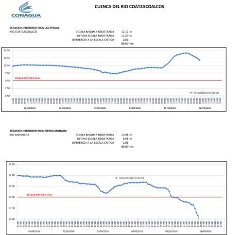 El nivel del río Coatzacoalcos después de alcanzar una escala máxima de 12.12 m, 3.58 m, por arriba de su escala crítica de 8.54 entre las 23:00 y 24:00 horas de ayer domingo 5 de septiembre a la altura de la Estación de Las Perlas, municipio de Jesús Carranza, ha iniciando su descenso, a las 9:00 horas de hoy registró una escala de 11.20 m, aún 2.66 m por arriba de su escala de desbordamiento.