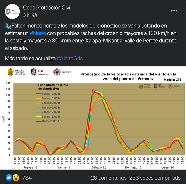 Rachas de viento de entre 110 a 130 kilómetros por hora afectarían al litoral veracruzano el próximo sábado 12, debido a un evento de “norte” asociado al Frente Frío número 35 en el Golfo de México.