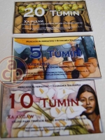 Túmin, en lengua totonaca, significa dinero. Con número y palabras en lengua indígena el billete tiene marcado su valor. Se lee «Mercado Alternativo y Economía Solidaria». Válido para trueque entre socios activistas.