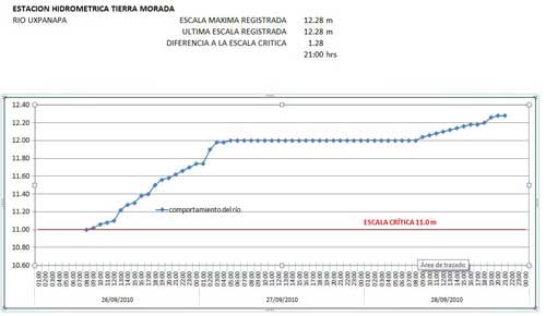 A las 21:00 horas en la estación de Tierra Morada, municipio de Las Choapas registró un nivel de 12.25 m, esto es 1.28 metros por arriba de su escala crítica.