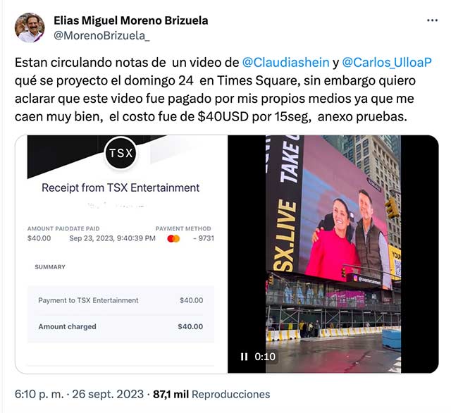 “Están circulando notas de un video de Claudia Sheinbaum y Carlos Ulloa que se proyectó el domingo 24 en Times Square; quiero aclarar que este video fue pagado por mis propios medios ya que me caen muy bien; el costo fue de $40USD por 15 seg., anexo pruebas” publicó Moreno Brizuela en su cuenta.