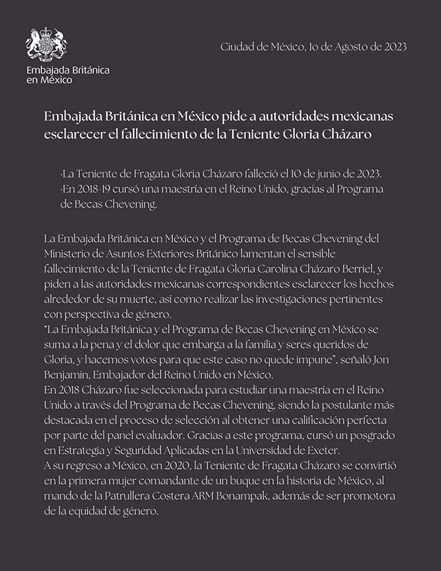 Por medio de un posicionamiento, la Embajada del Reino Unido en México pidió esclarecer la muerte de la Teniente de Fragata Gloria Carolina Cházaro Berriel, exalumna de la Universidad de Exeter por medio del programa de Becas Chevening.