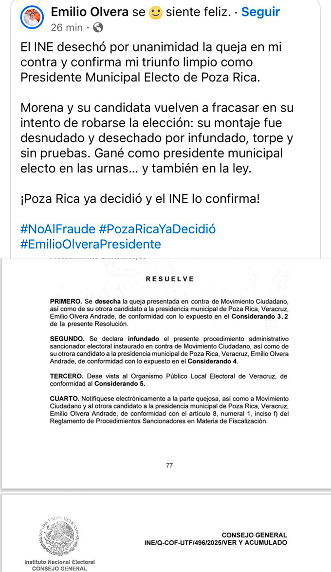 Emilio Olvera informa en redes sociales que INE confirmó su triunfo en Poza Rica