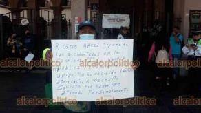 Acela Alvarado Vargas, trabajadora de la Dirección de Limpia Pública, se manifestó en los bajos del Palacio Municipal para solicitar audiencia con el Alcalde Ricardo Ahued Bardahuil y al mismo tiempo su intervención ante el Instituto Mexicano del Seguro Social (IMSS), ya que acusa que tras el accidente que sufrió mientras trabajaba no ha sido atendida debidamente.
