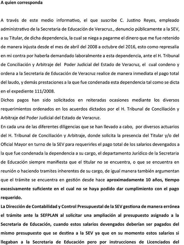 Empleado administrativo de la SEV sigue exigiendo pago de laudo