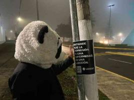 Tres osos en motocicletas fueron captados pegando carteles en distintos puntos de la ciudad, cuyos mensajes forman parte de una campaña de sensibilización denominada “La depresión es un problema real”, en la que se invita a reflexionar sobre este problema de salud, además invitan a la población a generar discusión en las redes sociales.