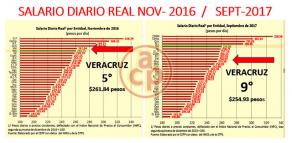 En el caso del estado de Veracruz, para noviembre del año 2016 el Salario Diario Real era de 261.84 pesos, por arriba de la media nacional, por debajo de la Ciudad de México (328.79 pesos), de Campeche (308.75 pesos), de Nuevo León (289.25 pesos) y de Querétaro (289.09 pesos).