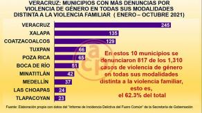 Estos diez municipios sumaron 817 de las mil 310 denuncias que recibió la Fiscalía General del Estado de Veracruz por el delito de “Violencia de género en todas sus modalidades distinta a la violencia familiar”, cifra que representa el 62.3 por ciento del total.