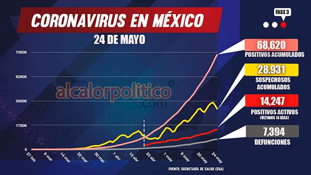 En las últimas 24 horas, México otras 215 muertes por COVID-19 y 2 mil 764 nuevos casos confirmados. En total, el país acumula 7 mil 394 decesos y 68 mil 620 contagios, informaron autoridades de la Secretaría de Salud, este domingo.