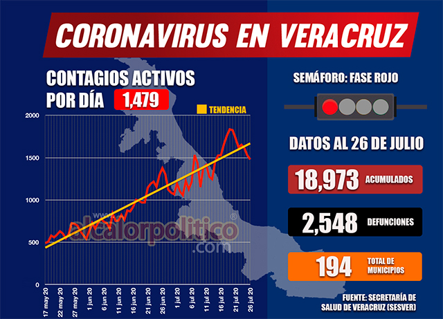 Con 250 nuevos contagios de sábado para domingo, la entidad acumula 18 mil 973 casos de coronavirus en 194 municipios; 2 mil 548 veracruzanos han fallecido por este padecimiento, 23 en las últimas 24 horas.