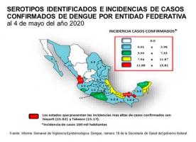 Por otra parte, en el documento “Panorama Epidemiológico de Dengue, 2020”, a la Semana Epidemiológica 18, actualizada al cuatro de mayo, la Dirección General de Epidemiología de la Secretaría de Salud, da a conocer que los estados con más casos confirmados de Dengue son: