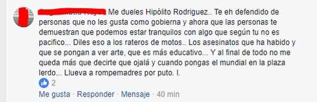 "Me duele Hipólito Rodríguez... te he defendido de personas que no les gusta como gobiernas y ahora que las personas te demuestran que podemos estar tranquilos con algo que según tú no es pacífico... Dile eso a los rateros de motos... Los asesinatos que ha habido (sic) y que se pongan a ver arte”.