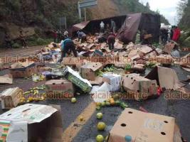 Un camión tipo torton cargado con 15 toneladas de legumbres, volcó la mañana de este jueves sobre la autopista Puebla-Orizaba, en el tramo conocido como Cumbres de Maltrata.