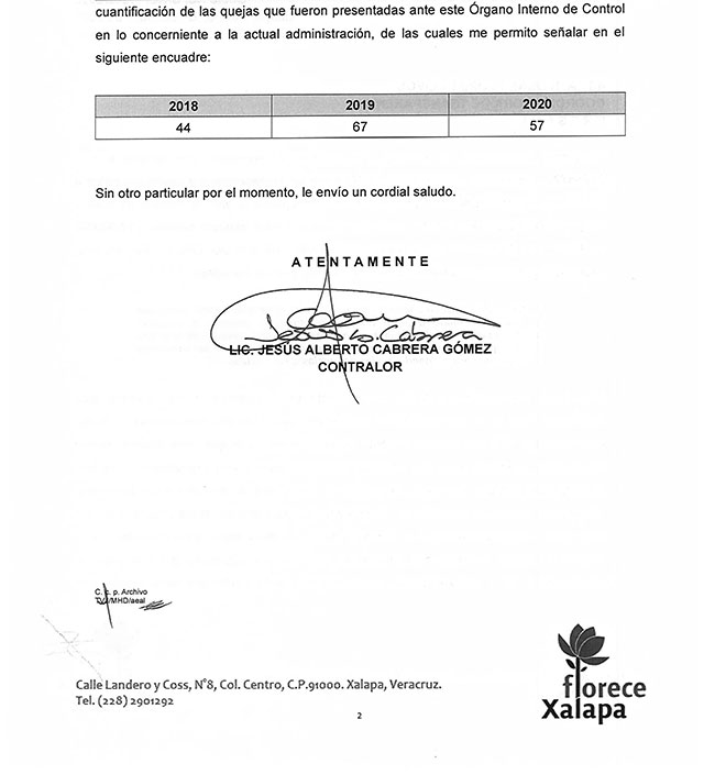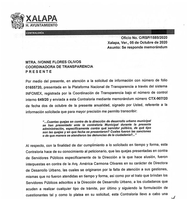 En atención a la solicitud de información 01655720, el contralor del municipio de Xalapa, Jesús Alberto Cabrera Gómez, refirió que contra Carmona Olivares se formularon 168 quejas ante el órgano de control interno.