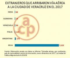 En su informe “Entradas aéreas, por continente, país de nacionalidad y punto de internación, enero-diciembre de 2017”, la Unidad de Política Migratoria de la SEGOB indica que en el aeropuerto de la ciudad de Veracruz arribaron el año pasado siete mil 122 estadunidenses.