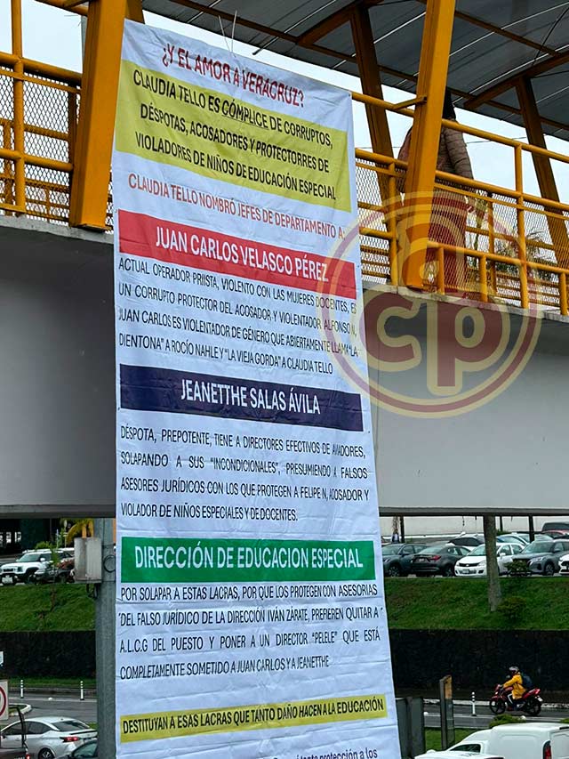 Xalapa, Ver., 17 de junio de 2025.- En el puente peatonal a la altura de la SEV fue colgada una lona en la que acusan a la titular de la dependencia, Claudia Tello, de nombrar como jefes de despacho a presuntos encubridores de corrupción y abuso de menores.