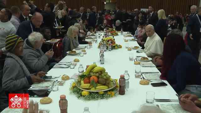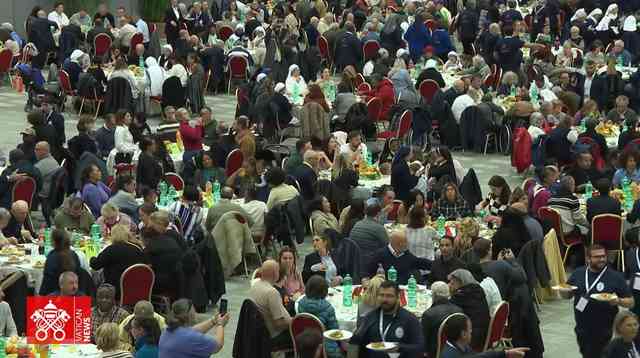 Vaticano, 16 de noviembre de 2025.- En el marco del día Mundial de los Pobres, en el Aula Pablo VI, hubo 1300 invitados de todas partes que disfrutaron del almuerzo ofrecido por la familia vicenciana. Al final, la bendición papal, acompañada del renovado agradecimiento del Papa León XIV a todos.